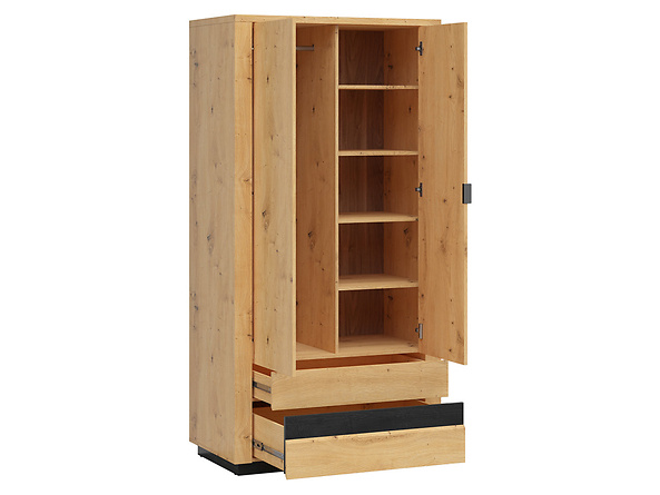 Szafa Ostia to odpowiedź na bolączki związane z przechowywaniem i organizacją ubrań. Sukienki, garnitury i jeansy zawieś na wieszaku, a te w dużej przestrzeni wyposażonej w drążek na wieszaki. Bluzki, t-shirty i swetry poskładaj na półkach, a bieliznę umieść w 2 dużych szufladach znajdujących się w dolnej części mebla.