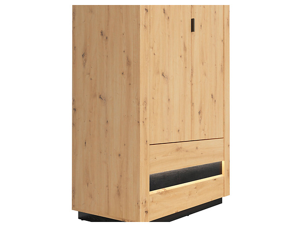 Mebel zachwyca pogrubionymi bokami korpusu i naturalną kolorystyką dąb artisan. Ozdobnym akcentem jest listwa w kolorze spalona deska oraz podkreślające ją oświetlenie LED. Czarna podstawa dodaje charakteru bryle.