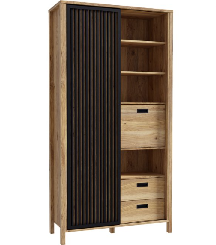 ⭐W centralnej części regału jest szafka z przesuwanymi drzwiami z lamel, za którymi kryje się pięć dodatkowych wnęk.