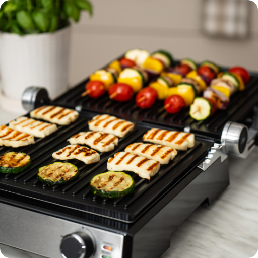 Grilluj na dwóch rusztach jednocześnie! Obie części grilla możesz ustawić w poziomie, aby podwoić powierzchnię do przygotowywania takich produktów jak ser typu oscypek, halloumi, czy kiełbaski.