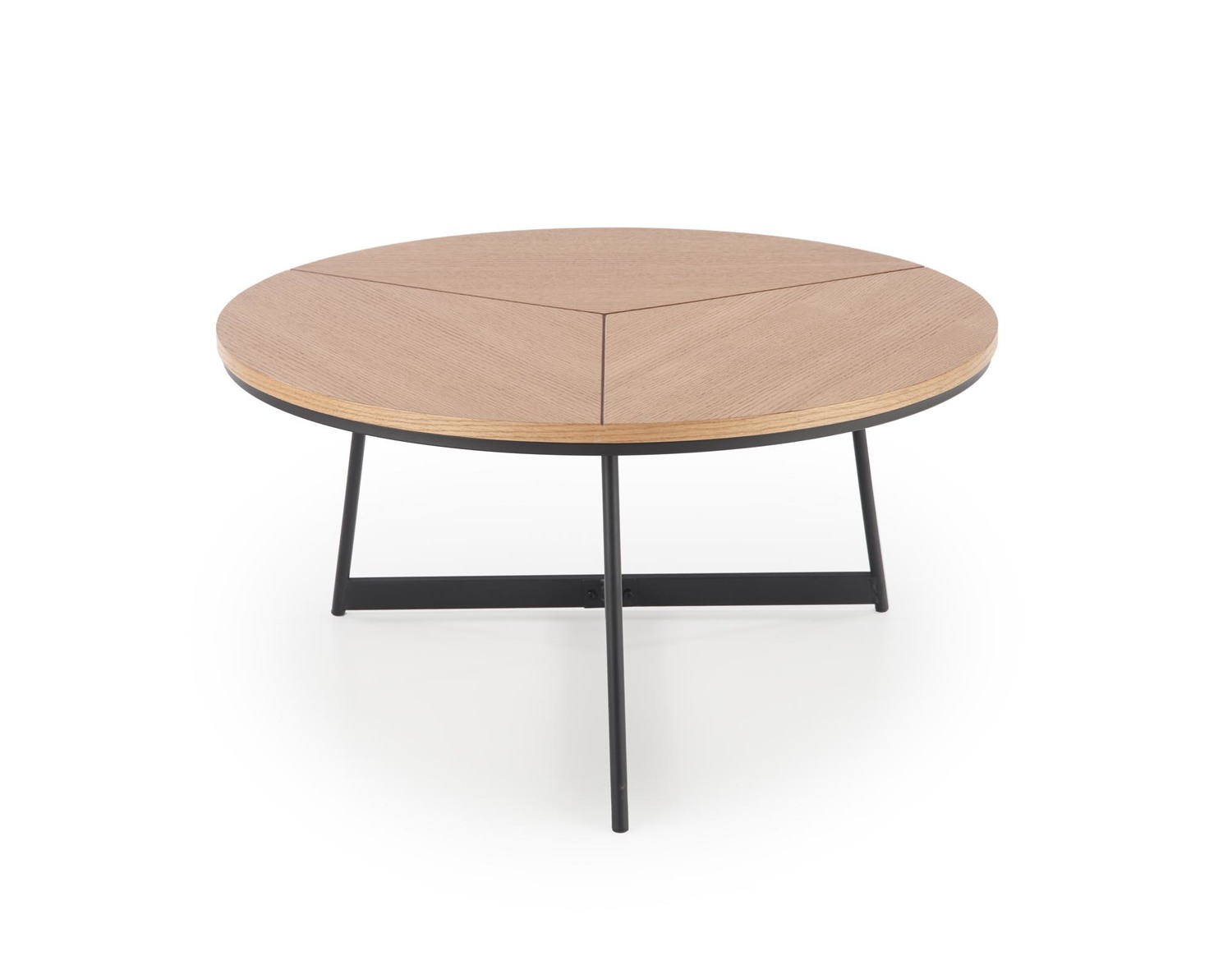 Ława to okrągły mebel o średnicy 80 cm i wysokości 41 cm, idealny do postawienia przy kanapie lub fotelu. Blat ławy jest wykonany z płyty MDF z okleiną naturalną w kolorze dębu naturalnego, a stelaż z metalu malowanego proszkowo na czarno. Blat jest podzielony na trzy części, co nadaje mu ciekawy i geometryczny wygląd.