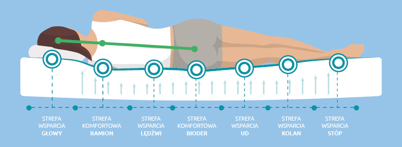 Każdy nasz materac kieszeniowy (poza młodzieżowym modelem Posito) oraz piankowy przeznaczony dla dorosłego użytkownika posiada 7 stref twardości ergonomicznie dopasowanych do kształtów ludzkiego ciała.