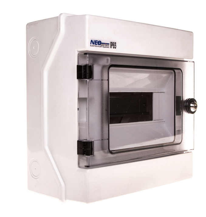 Obudowa wykonana z trwałego tworzywa sztucznego w kolorze białym (RAL 9003) zapewnia odporność mechaniczną i estetyczny wygląd. Rozdzielnica wyposażona jest w zamek, co zwiększa bezpieczeństwo i chroni przed dostępem osób niepowołanych.