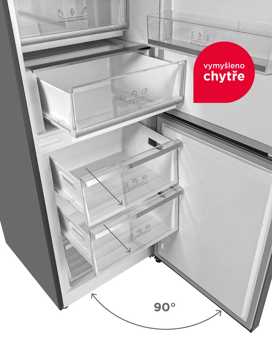 Lodówkę LK6660ss dzięki sprytnie wykonanemu sposobowi otwierania drzwi można również umieścić w wąskich przestrzeniach lub w pobliżu ściany. Aby wyciągnąć szuflady z lodówki i zamrażarki, wystarczy otworzyć drzwi tylko do 90°.