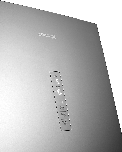 Lodówka wyposażona jest w panel dotykowy z delikatnym białym podświetleniem. Na wyświetlaczu widać aktualną temperaturę chłodzenia i zamrażania oraz aktywowane funkcje.