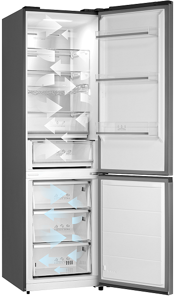 Innowacyjna funkcja NO FROST zapobiega osadzaniu się szronu nie tylko w zamrażarce, ale także w lodówce. System cyrkulacji utrzymuje niską temperaturę oraz stały poziom wilgoci w lodówce