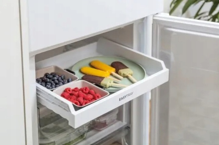 Specjalnie zaprojektowana szuflada w formie tacy w komorze zamrażarki umożliwia doskonały przegląd przechowywanych mrożonek - nie można przeoczyć nawet tych, które znajdują się na samym końcu. Szuflada umieszczona jest w górnej części zamrażarki. Szufladę można wysunąć aż do samego końca, tak że można sięgnąć do wszystkich rzeczy w szufladzie.