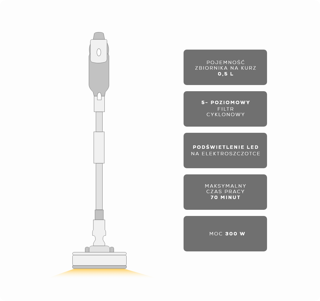 Wydajna bateria o pojemności 2500 mAh zapewnia nawet do 70 minut nieprzerwanej pracy. To wystarczająco dużo czasu, by dokładnie odkurzyć całe mieszkanie – bez konieczności ładowania w trakcie sprzątania.