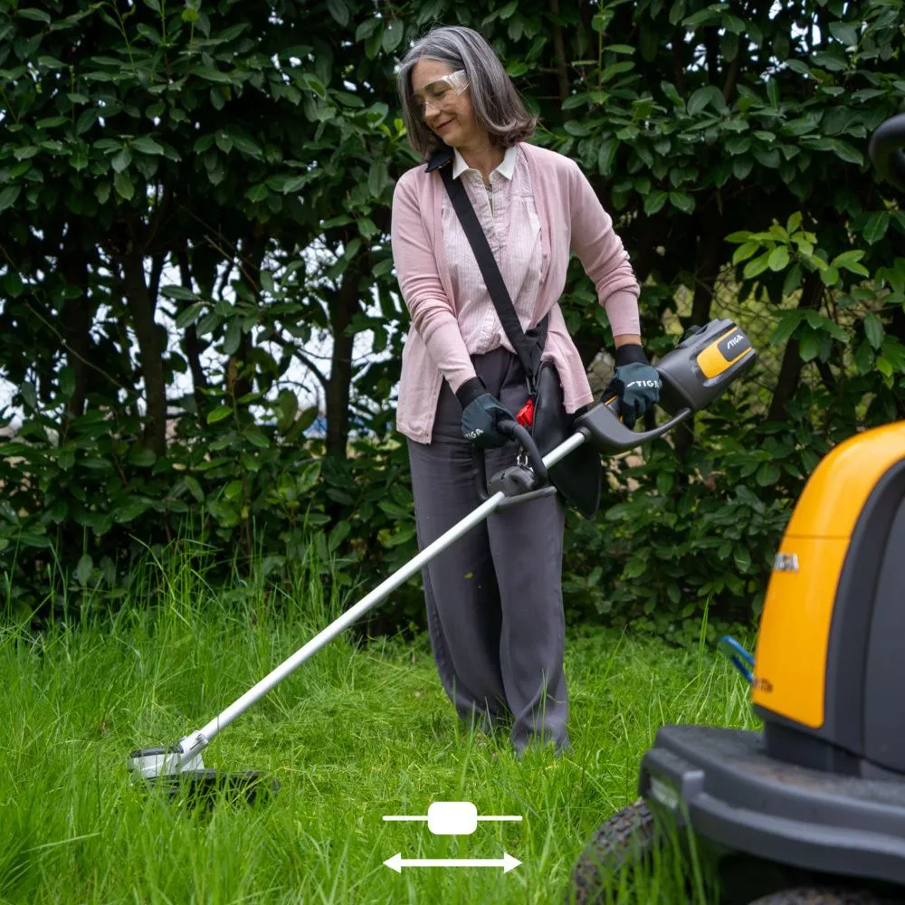 - Zasilanie akumulatorowe zapewnia bezprzewodową, komfortową pracę bez uciążliwych kabli podczas koszenia.